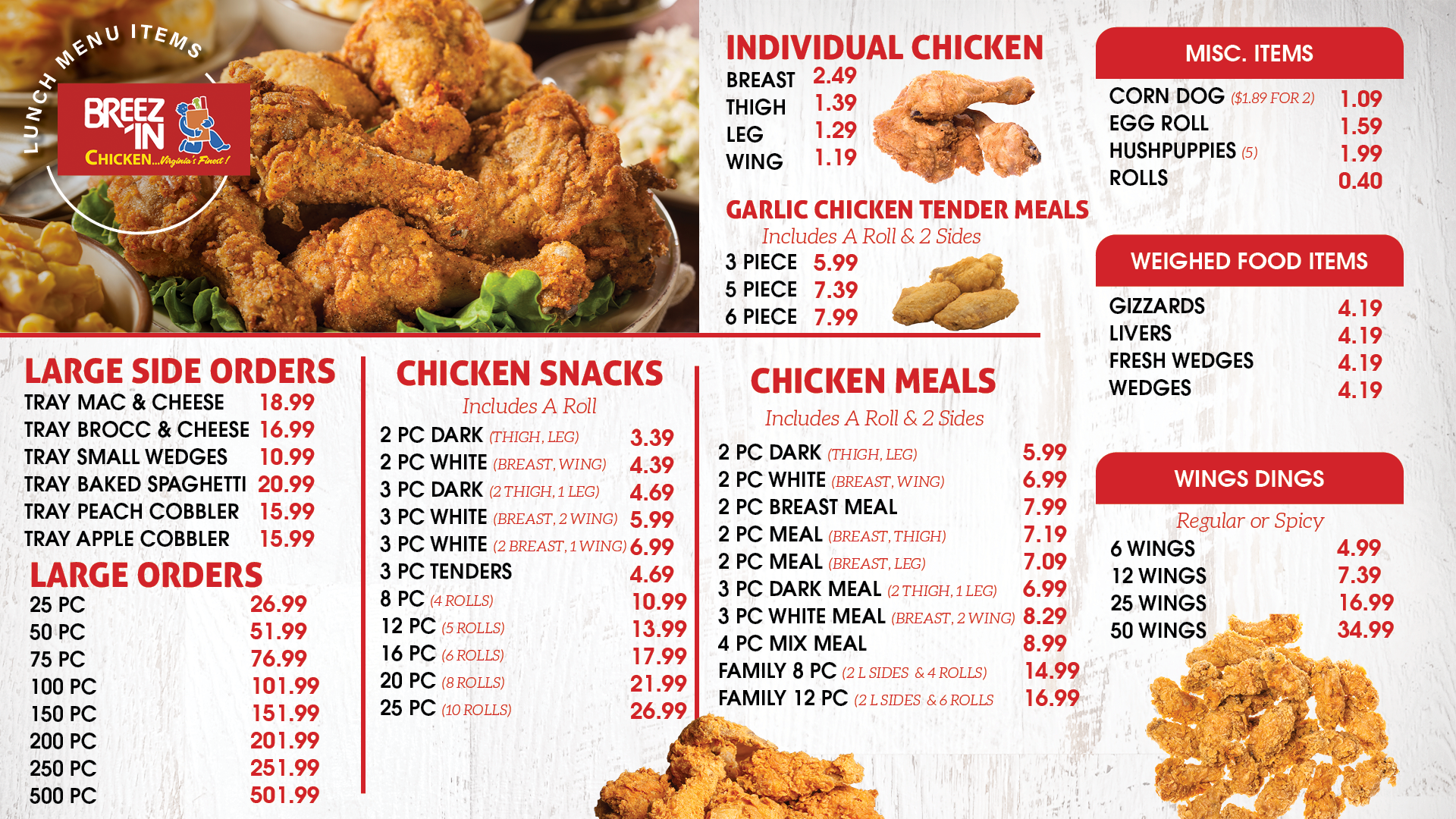 Our famous "Virginia's Finest" fried chicken, fresh never frozen! Along with other offerings and large catering orders.